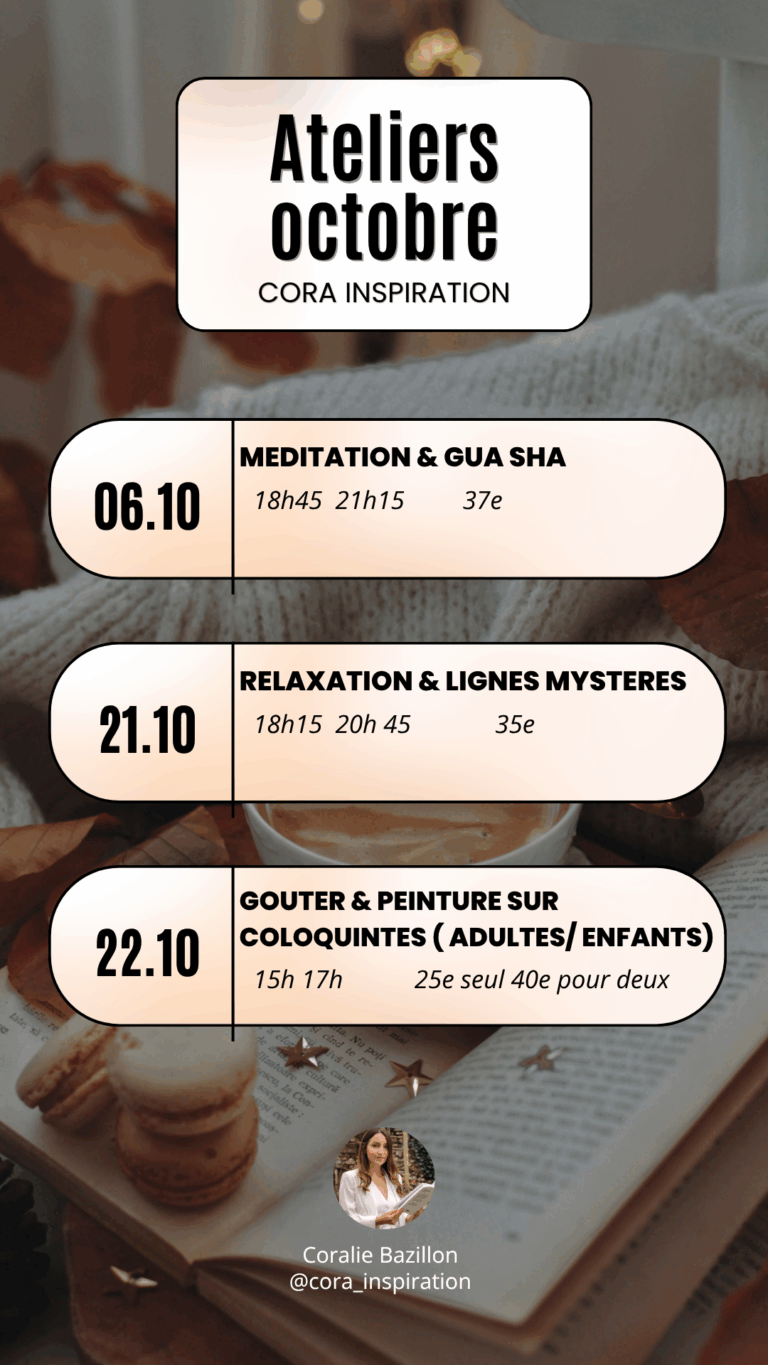 Régulièrement je créer pour vous, votre développement personnel et surtout votre mieux être au quotidien de nouveaux ateliers de groupes adultes ou/et enfants. Ceux-ci sont annoncés sur les réseaux sociaux de Cora inspiration.